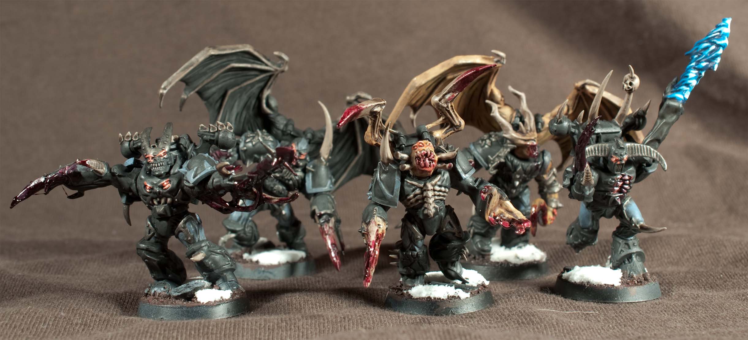 Moving on to more important things, I have another instalment of 30 Days of Paint! I’m making a slight addendum to my rule set. If I paint more than one figure in a day, it still counts. I think that’s a fair rule don’t you? So today I painted up the rest of my Possessed Chaos marines squad. These guys were fun. I really like the way the second set of wings turned out in the grey. I think it looks a little better than the color I used on the first set of wings. I used Devlan mud and Nuln Oil to blend all the colors together. I have to say, I’m really going to miss my devlan mud when I run out of it (I have something like 7 or 8 pots of it). It’s what I use on bone colors. The new agrax earthshade just doesn’t do it. I’ve heard of some similar paints out there so I might have to give them a try.