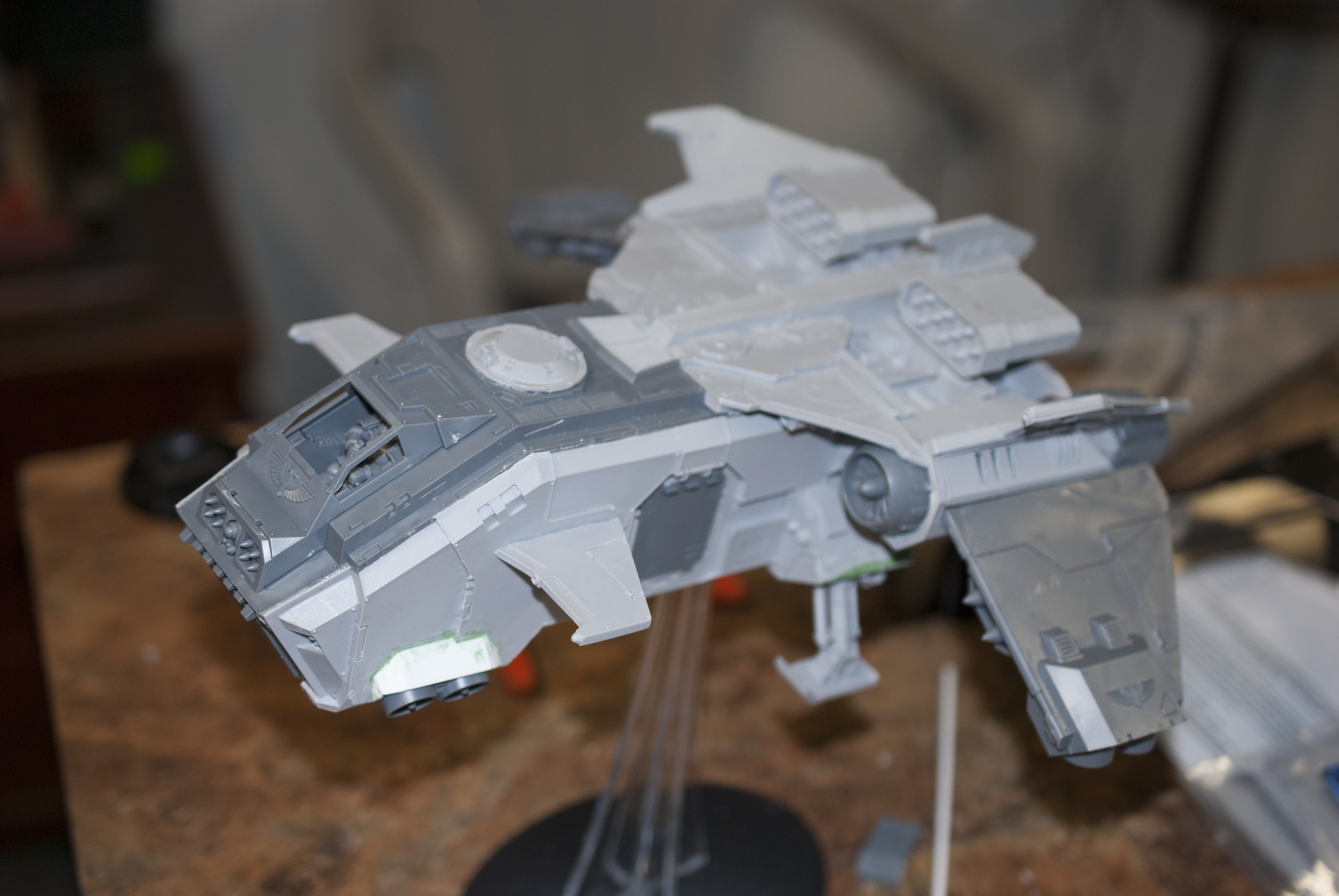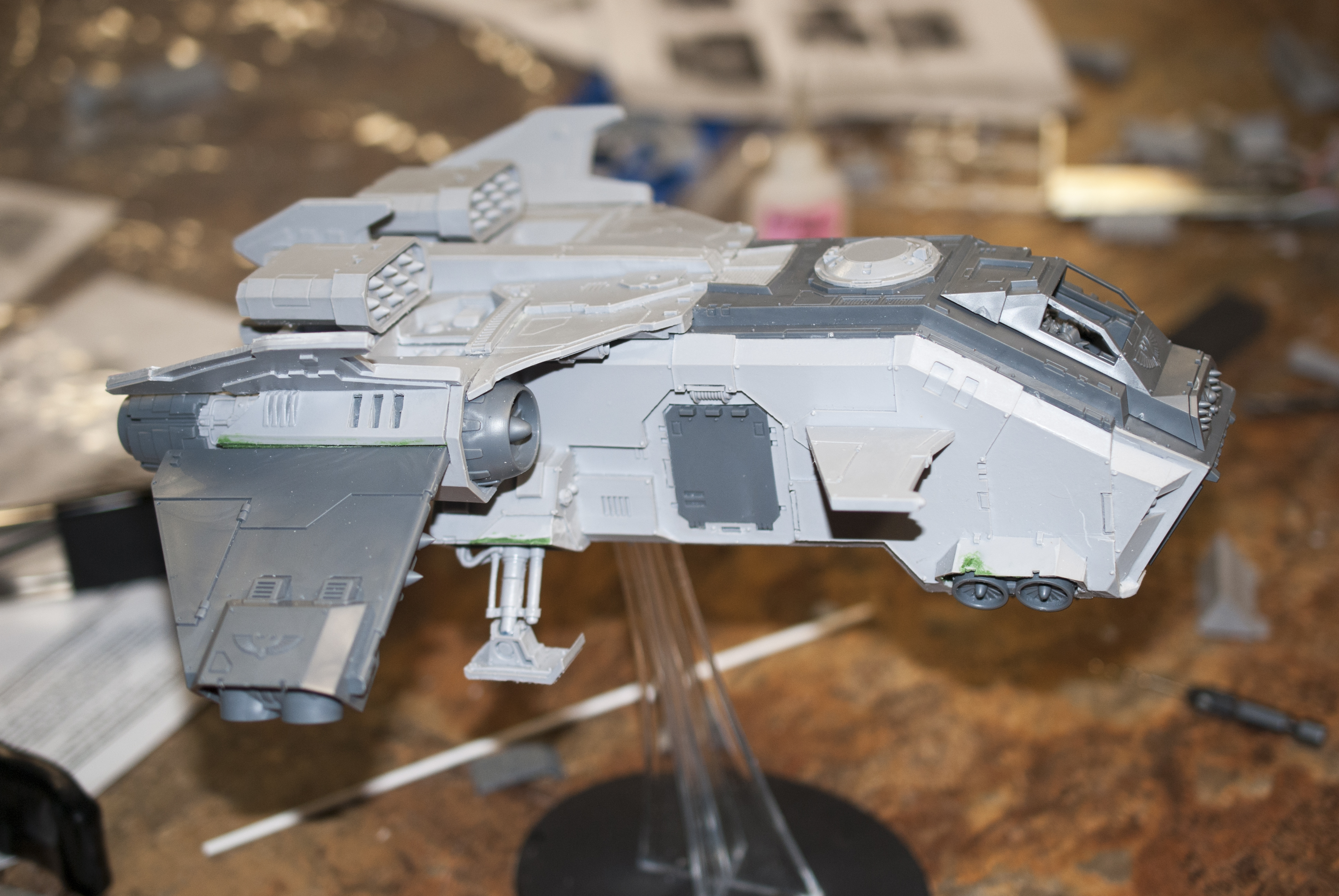 The rear ramp was tricky as I had to sand the sides and the bottom to fit. I actually had to cut off the little mounting brackets on the back to get it to fit right. This was disappointing but, it didn’t look too bad. I decided to go with hell strike missiles if for no other reason than I couldn’t use the lascannons and figured while I was at it I would make it a missile boat and add the typhoon missile launcher in the nose. I have the canopy glued up without the glass so I can paint it without having to mask the glass parts off. Also the landing gear is all magnetized for ease of transport when I get this thing a case.